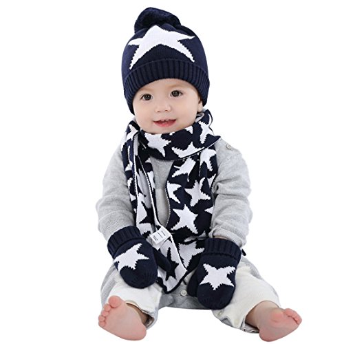 bieten Happy Cherry Mütze 3tlg Kindermütze Winter Strickmütze Herbst Pudelmütze Schal Handschuhe Set Sternenmuster Gehäkelt Wintermützen coole Mütze für Baby Kinder Schnee Hut Bommelnmütze Kopfumfang 48-52cm für 1-4 Jahre